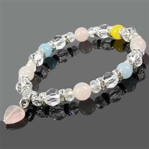 ローズクォーツ玉約8mm/ブルーとイエロージェイド玉約8mm/ローズクォーツハート約10mm/ガラスビーズ